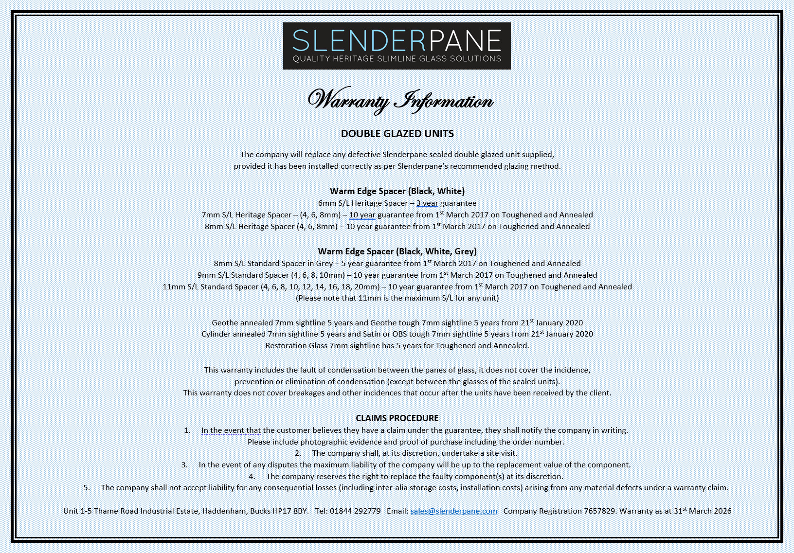 All Slenderpane units come with a warranty and now most of our units have a 10 year warranty. For full details please check our Warranty.